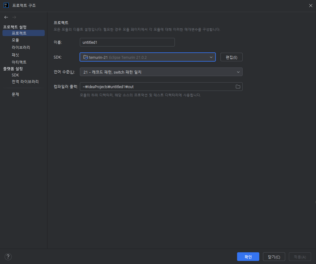 - Project Language Level: 원하는 Java 언어 수준을 설정합니다(예: 21 - (latest)).