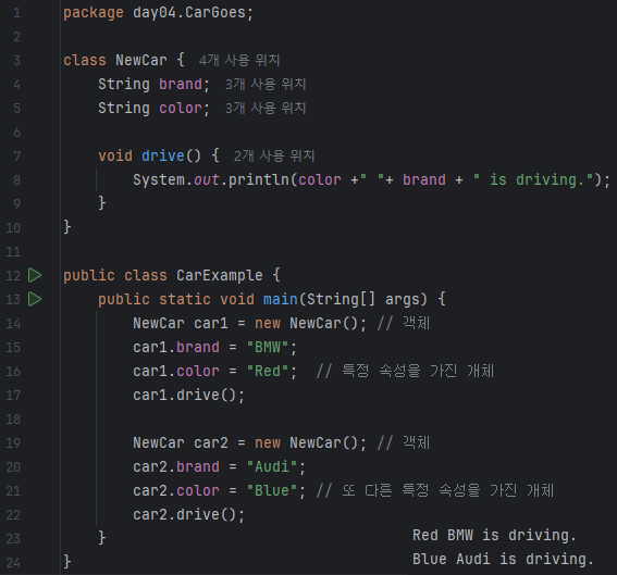 - 객체는 설계도로 만든 실제 자동차: