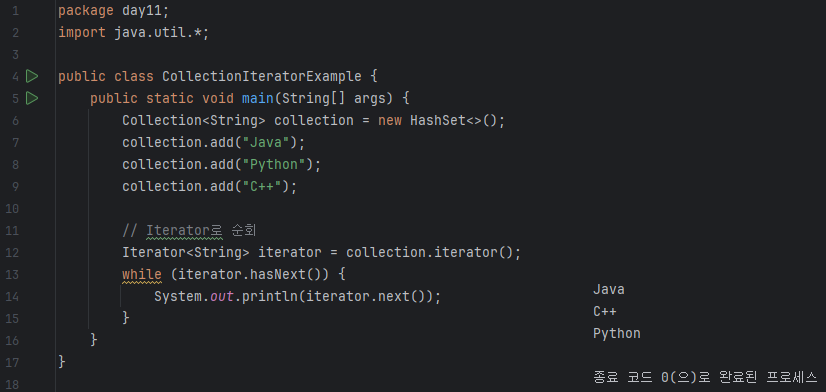 - Collection 인터페이스와 Iterator 인터페이스를 사용하여 컬렉션의 요소를 순회하는 코드